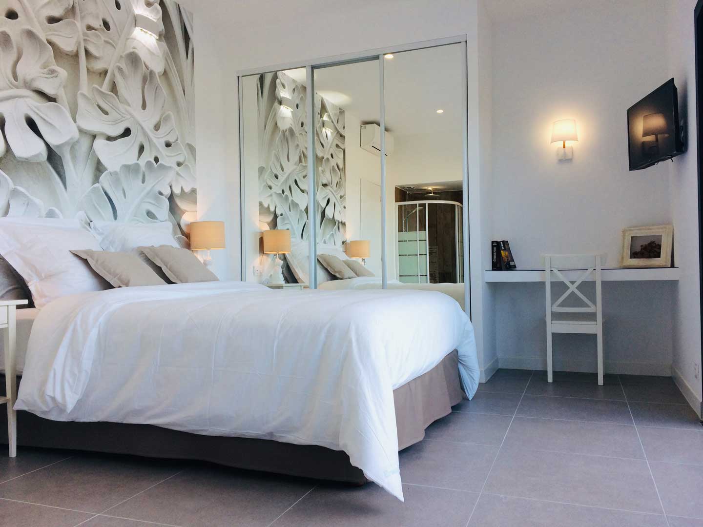 -1 chambre avec terrasse vue panoramique, lit en 160, matelas qualité hôtellerie de luxe, salle d’eau privative, placard de rangement, TV 80cm