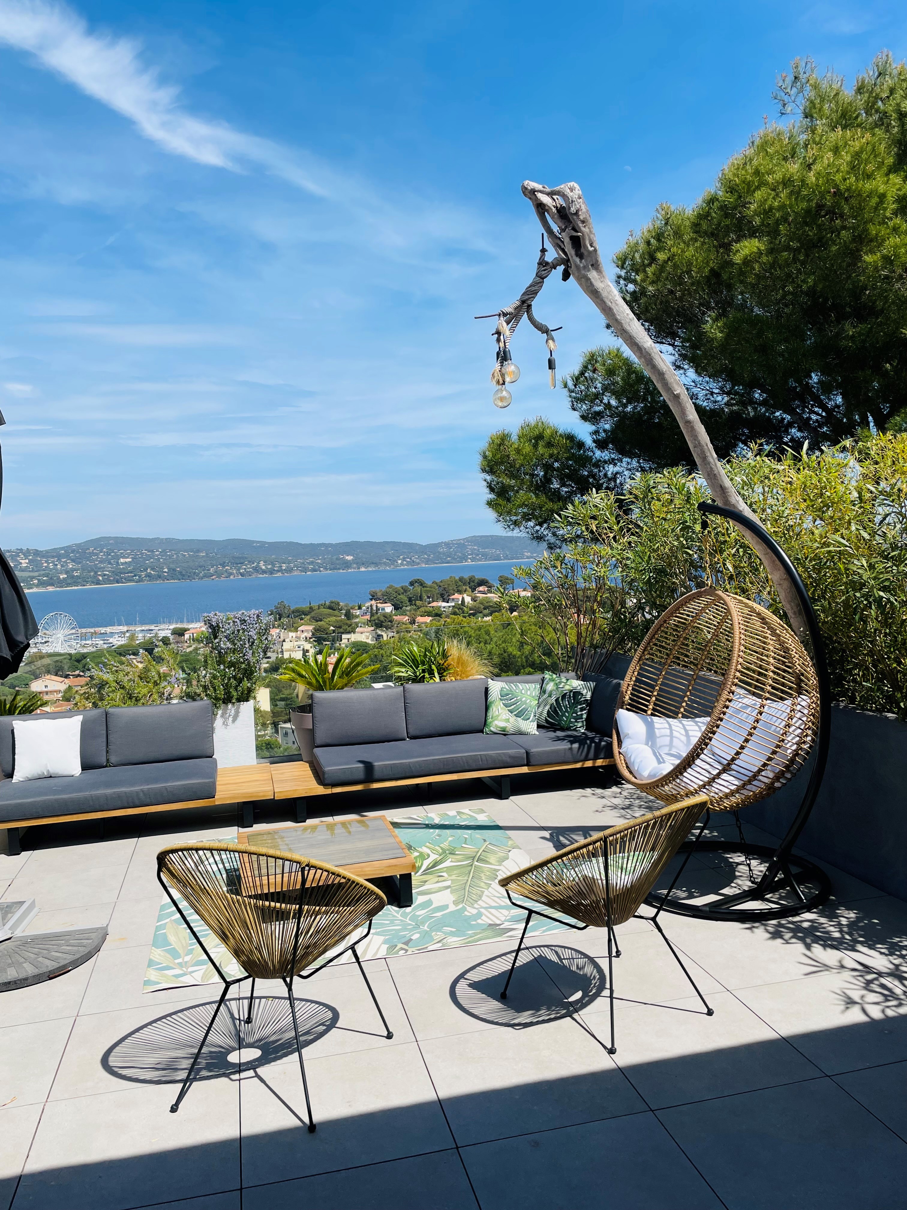 La villa MAEVA offre une magnifique vue panoramique qui s’étend sur toute la baie de Cavalaire jusqu’au cap Lardier et se poursuit sur les Iles d’Or (îles du Levant, Port Cros et Porquerolles).